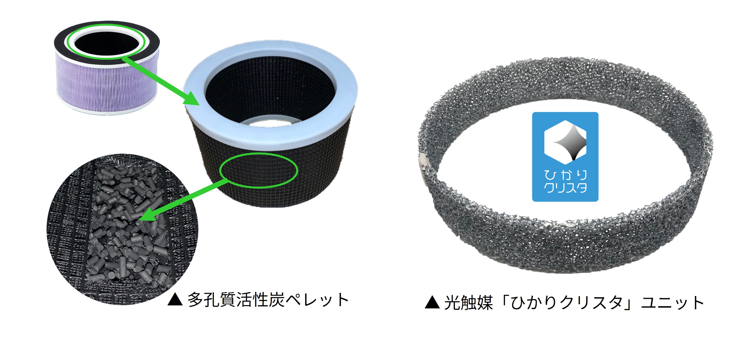 活性炭で吸着しきれなかったニオイ成分は、酸化チタン光触媒「ひかりクリスタ」が分解・無害化。