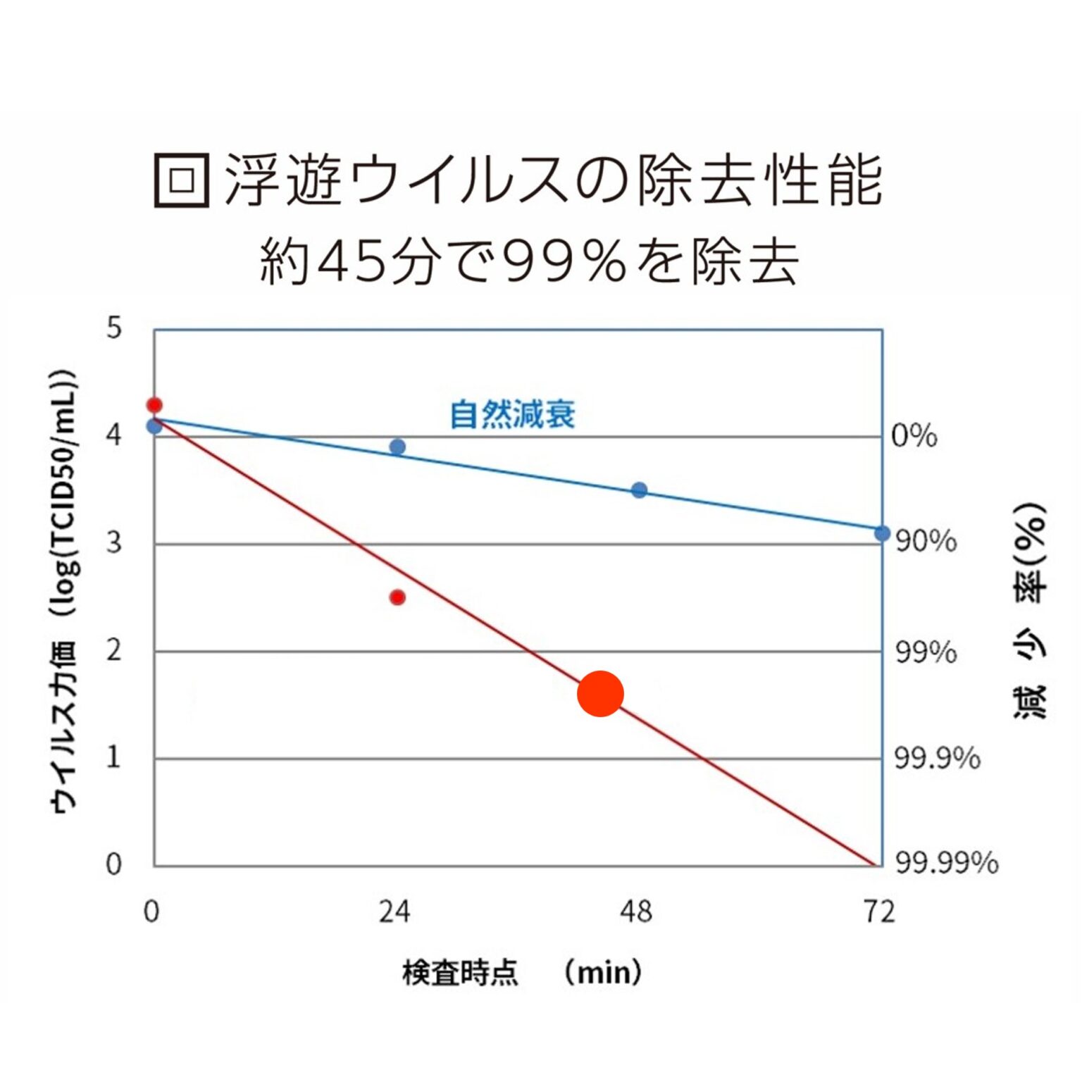 ウイルスや菌に本当に効果がありますか?第三者機関による試験で、浮遊ウイルスは約45分、浮遊菌は約36分で99%除去されることが確認されています。